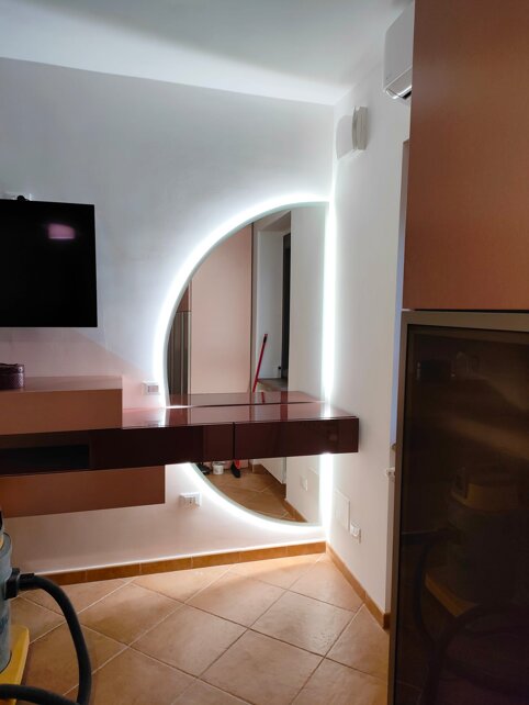 Specchi su misura personalizzati, per arredamento civile e commerciale, con installazione sistemi led, rivestimento pareti con specchi di sicurezza, specchio con TV incorporata, sagomature su disegno CAD, decorazioni personalizzate.